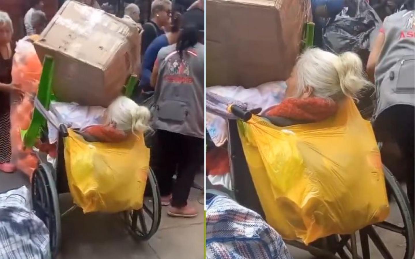 Las imágenes viralizadas muestran a una adulta mayor sentada en su silla de ruedas, mientras le van cargando diversos objetos encima, sin consideración alguna. Esto ha generado indignación entre los usuarios.