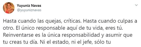 “Hasta cuando las quejas, críticas. Hasta cuando culpas a otro. El único responsable aquí de tu vida, eres tú. Reinventarse es la única responsabilidad y asumir que tu creas tu día. Ni el estado, ni el jefe, sólo tú”, escribió la actriz de teleseries e instructora de yoga en su cuenta oficial de Twitter (@yuyuniznavas).