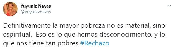 Luego de recibir diversas críticas e insultos por sus palabras, Navas tuiteó nuevamente. "Definitivamente la mayor pobreza no es material, sino espiritual. Eso es lo que hemos desconocimiento, y lo que nos tiene tan pobres", expresó la comunicadora, quien agregó el hashtag #Rechazo a su posteo, el cual también generó cuestionamientos.