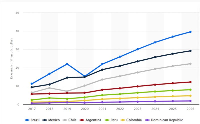 Ganancias 2017-2021 y previsiones hasta 2026 (en millones de dólares estadounidenses) para Casino App Revenue in Chosen LATAM Countries. Evaluación de Statista.