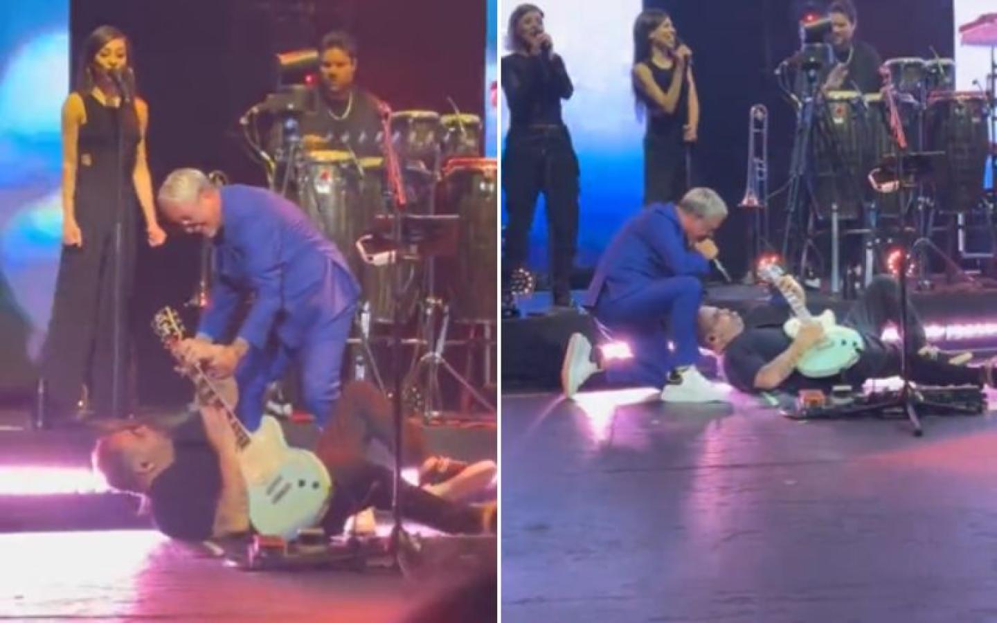 Mientras interpretaba el mencionado éxito, el cantante volteó y pasó a llevar al guitarrista, quien cayó con su instrumento musical.