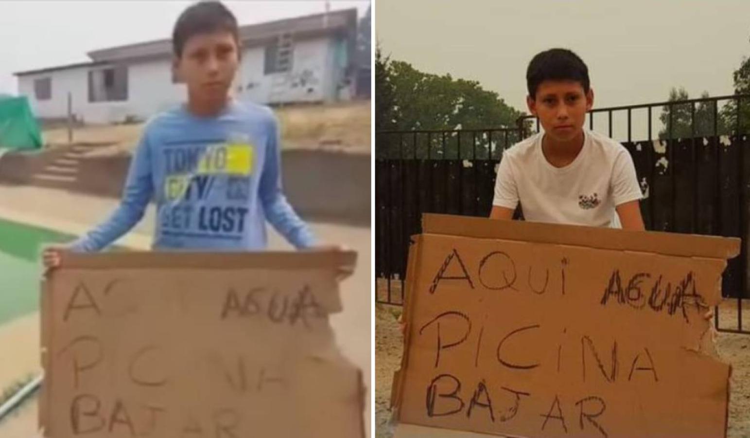 El niño se llama Daniel Sandoval, quien se paró al frente de su casa con un cartel de cartón en el que escribió "Aquí agua. Piscina. Bajar".