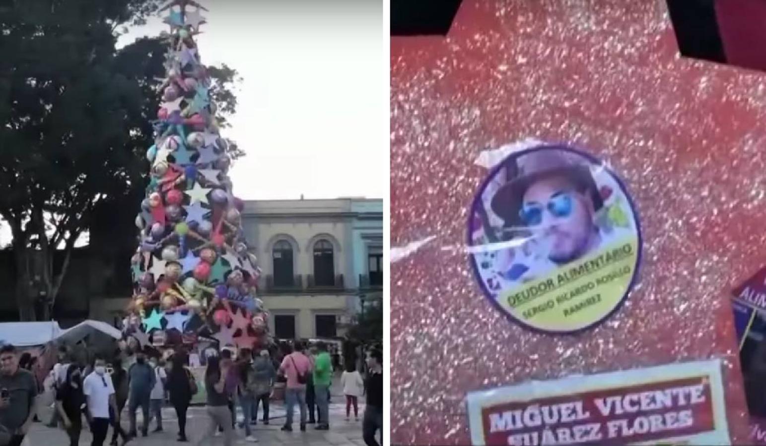 Adornan enorme árbol de Navidad con fotos de papás deudores de alimentos