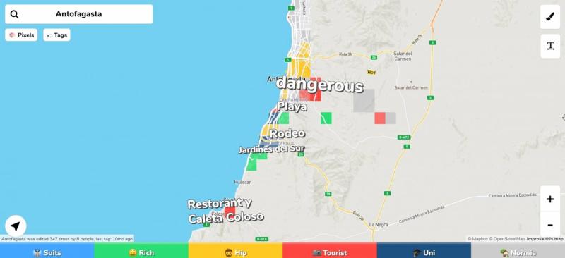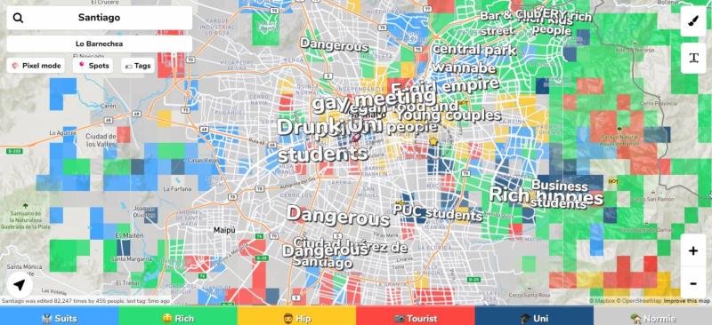 Se trata de “Hoodmaps”, una web creada por el holandés Peter Levels inserta en Google Maps que entrega datos que califican ciertos lugares. Les ponen colores (“Pixels”) según si son zonas “suits”, adineradas, hipster, para turistas, universitarios o “normies”.