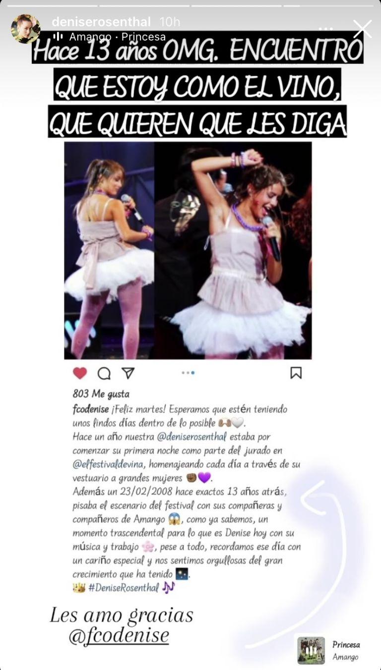 "Además un 23/02/2008 hace exactos 13 años atrás, pisaba el escenario del festival con sus compañeras y compañeros de 'Amango', como ya sabemos, un momento trascendental para lo que es Denise hoy con su música y trabajo, pese a todo, recordamos ese día con un cariño especial y nos sentimos orgullosas del gran crecimiento que ha tenido", agregaron.
