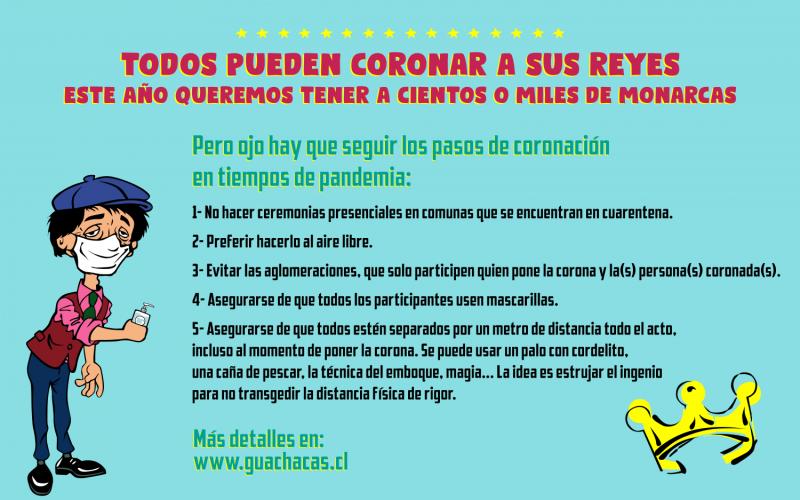 Asimismo, se hizo un llamado general a que quienes conozcan algún caso de generosidad digno de alabanza, y no anden encuarentenados, vayan y coronen a sus protagonistas. La idea es que graben un video de la ceremonia y lo manden a prensa@guachacas.cl con los datos básicos. De esta manera, será divulgado por el sitio oficial de Guachacas.