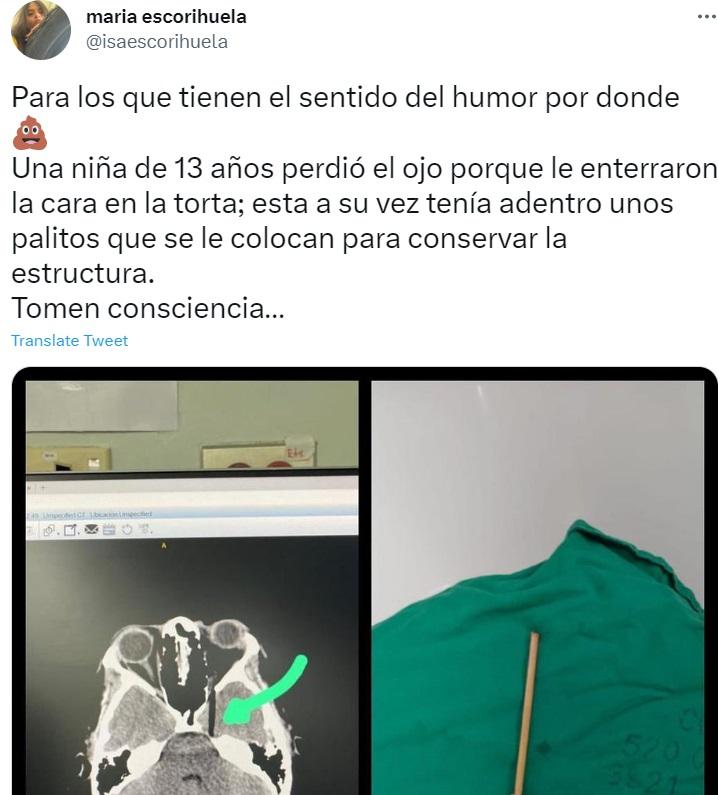 Otra usuaria contó lo que le pasó a una niña de 13 años: "Perdió el ojo porque le enterraron la cara en la torta; esta vez tenía adentro unos palitos que se le colocan para conservar la estructura".
