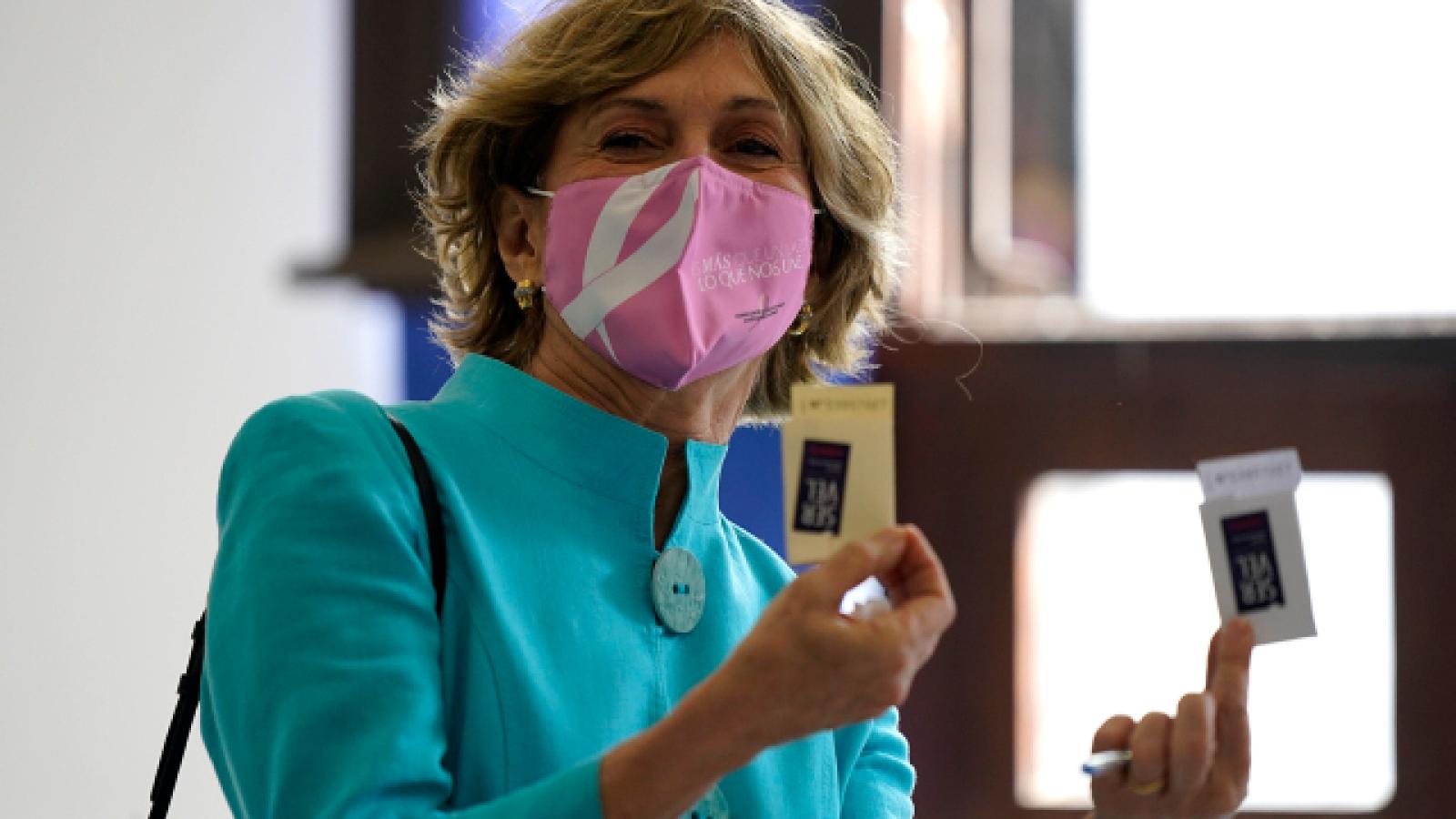 Evelyn Matthei se presenta a votar con una particular mascarilla
