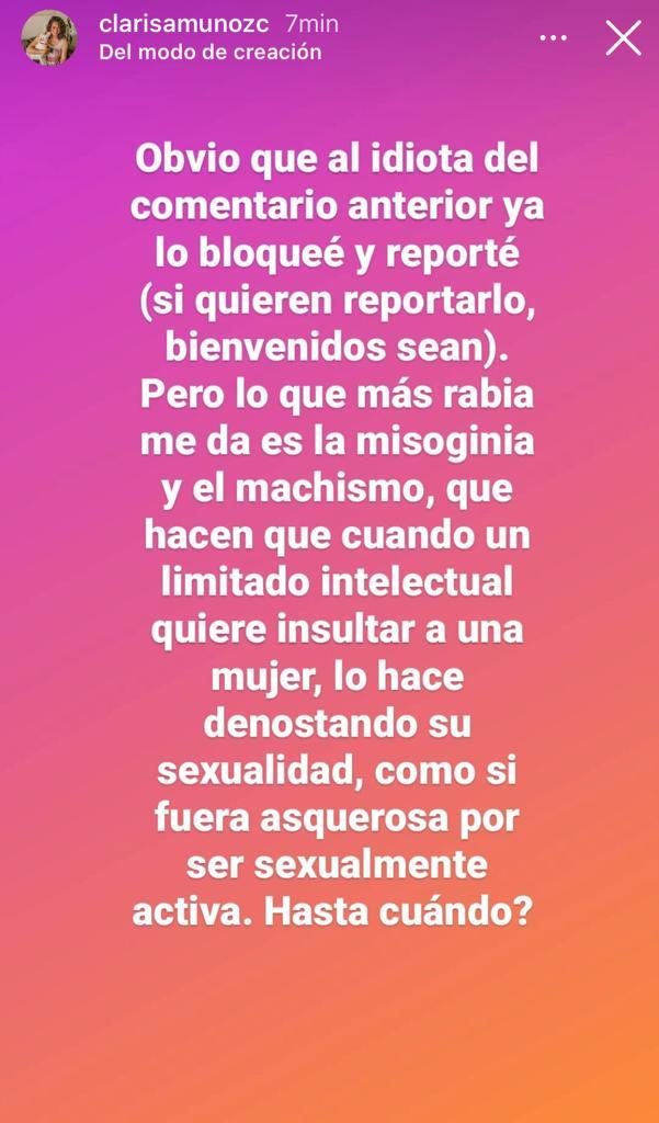 “Obvio que al idiota del comentario anterior ya lo bloqueé y reporté (Si quieren reportarlo, bienvenidos sean)”, escribió la integrante de Aquí somos todos, quien destacó que “lo que más rabia me da es la misoginia y el machismo, que hacen que cuando un limitado intelectual quiere insultar a una mujer lo hace denostando su sexualidad, como si fuera asquerosa por ser sexualmente activa. Hasta cuándo”.