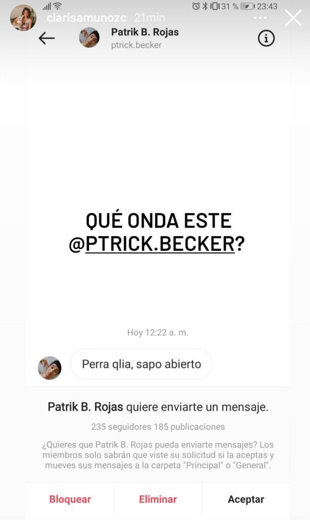 Clarisa Muñoz, quien integra el grupo de noteros del proyecto televisivo, compartió el mensaje que recibió de manera interna. “¿Qué onda este @ptrick.becker?”, preguntó la comunicadora al momento de dar a conocer el comentario que recibió por parte de éste. Asimismo, hizo su respectivo descargo.
