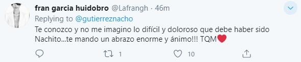 Fran García-Huidobro, amiga de Gutiérrez, le envió palabras de aliento a través de la misma vía. “Te conozco y no me imagino lo difícil y doloroso que debe haber sido Nachito...te mando un abrazo enorme y ánimo!!! TQM”, escribió la conductora de “Sigamos de Largo”.