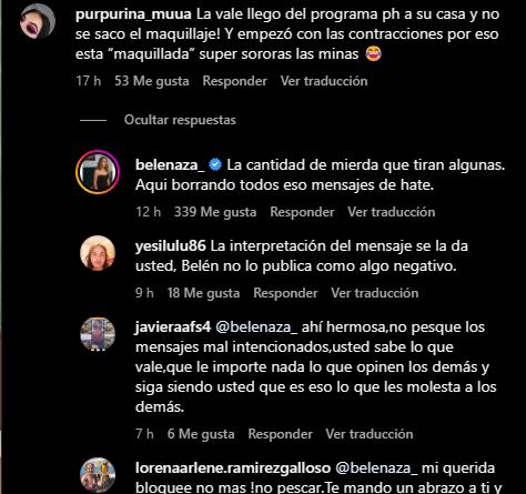 "La cantidad de mierda que tiran algunas. Aqui borrando todos eso mensajes de hate", respondió Belén Mora en un comentario sobre las críticas.