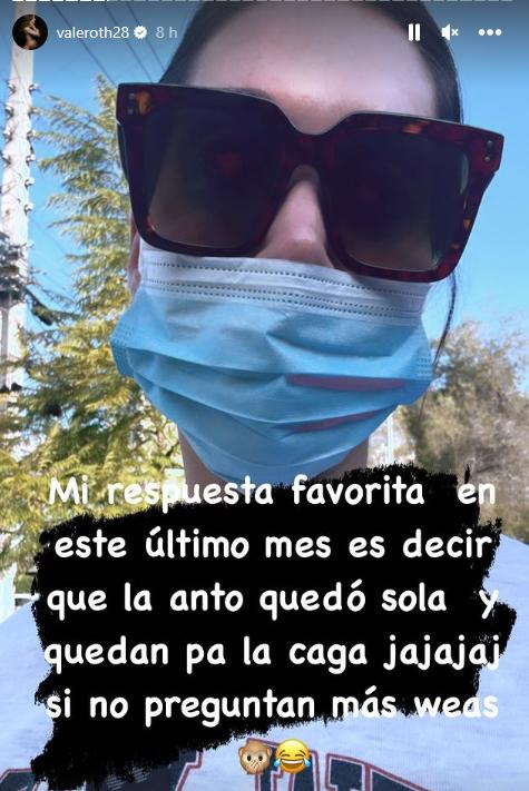“Mi respuesta favorita en este último mes es decir que la Anto quedó sola y quedan pa’ la caga jajaja Si no preguntan más hue…", escribió a través de stories.