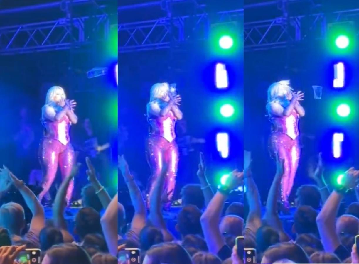 De inmediato, la artista se desplomó en el piso y quedó tendida por el dolor del acto, mientras sus fanáticos miraban sorprendidos por la situación que presenciaron.