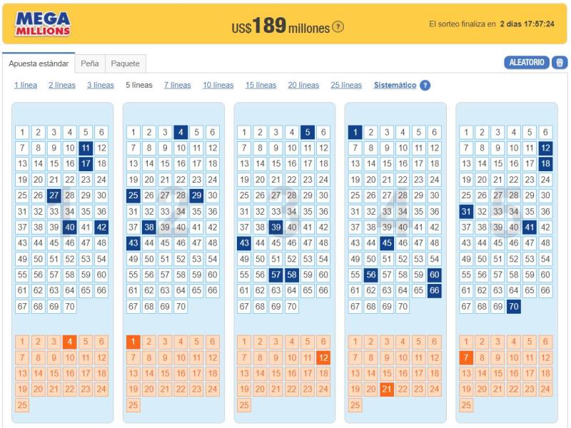 Entra en la página del Mega Millions en TheLotter y elige tus números de la suerte: cinco números principales y un número adicional.