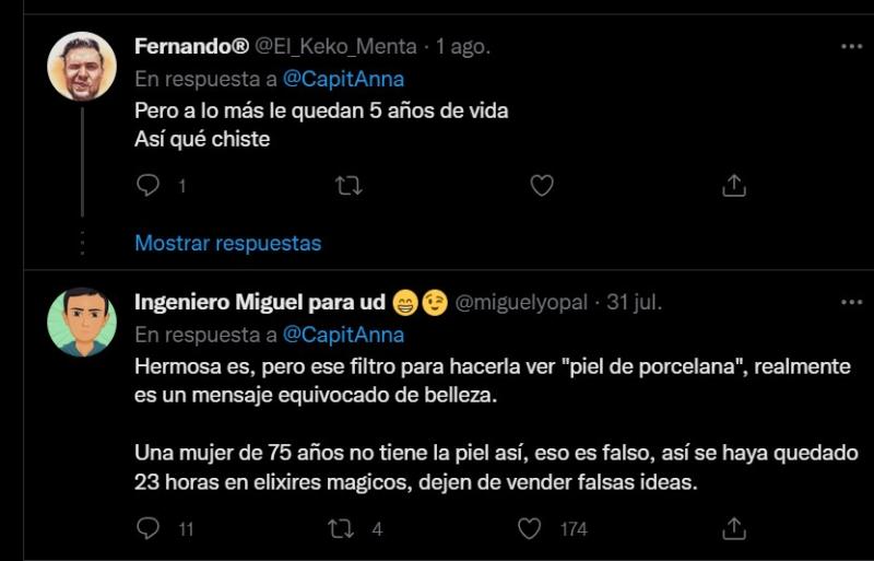 “Hermosa es, pero ese filtro para hacerla ver "piel de porcelana", realmente es un mensaje equivocado de belleza. Una mujer de 75 años no tiene la piel así, eso es falso, así se haya quedado 23 horas en elixires magicos, dejen de vender falsas ideas”, señaló otro.