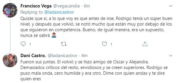 A raíz de la eliminación de Rodrigo Lemus, la cual fue desencadenada por una decisión de Castro, la chef e influencer usó su cuenta de Twitter para criticar a los ex participantes que “hablaban sofisticado, era súper ego y siempre miraban en menos los platos de lo demás”. Además, agregó que “Él (Rodrigo) volvió y se hizo amigo de Oscar (Barrera) y Alejandra (Orellana). Demasiados críticos del resto, envidiosos y se creen superiores”.