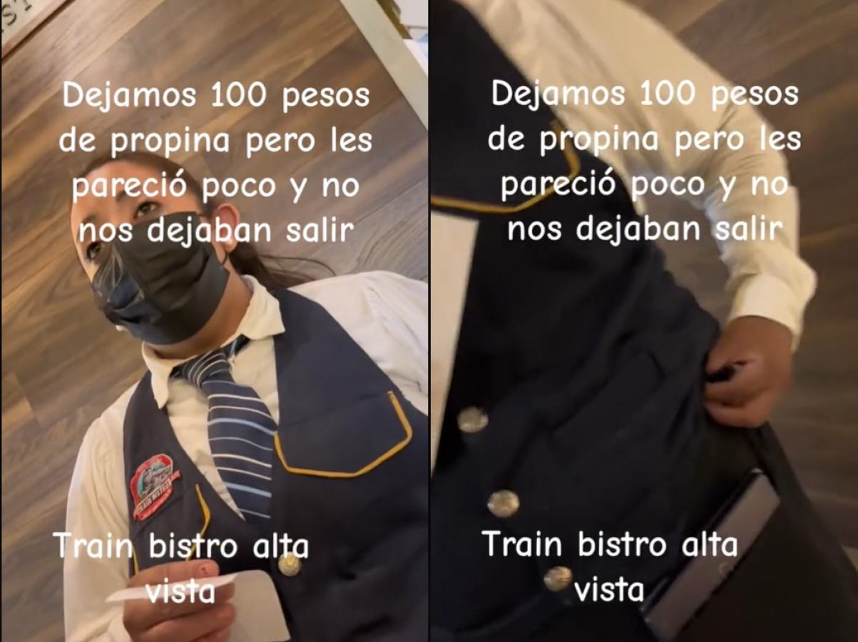 El registro que se viralizó en redes sociales muestra a la mesera pararse frente al grupo de jóvenes y decir "no es obligatoria la propina, pero...", siempre con su desplante firme, evitando la salida del local.