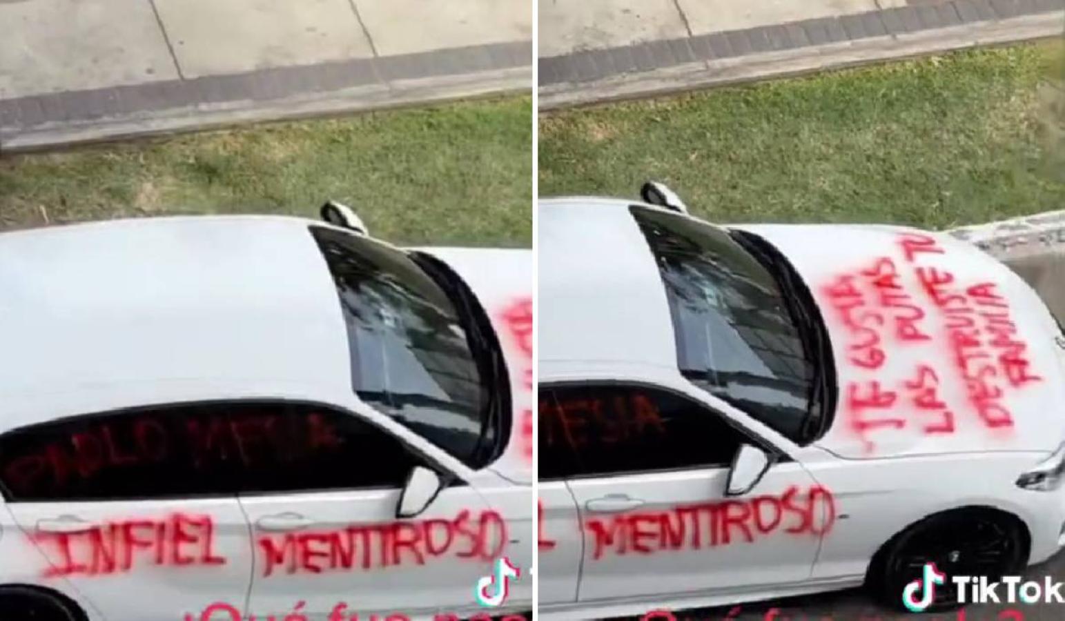 “Infiel”, “Mentiroso”, “Paolo Mesía” y “Te gustan las pu…. Destruiste tu familia”, se puede ver escrito en el capo, el maletero y las puertas del auto blanco.