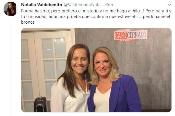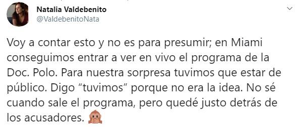 A través de su cuenta oficial de Twitter (@ValdebenitoNata), la actriz contó que fue parte de la grabación de uno de los capítulos del exitoso espacio televisivo. El hecho ocurrió en 2019 cuando visitó la ciudad de Miami, en Estados Unidos.