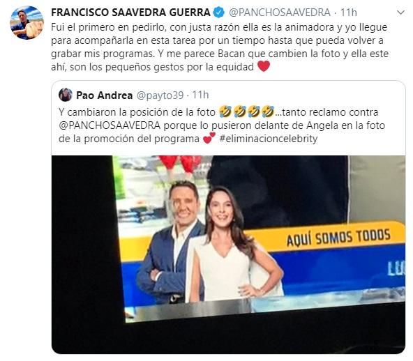 La nueva imagen que se utiliza para promocionar el espacio social del 13 tiene como figura central a Ángeles Araya, mientras que Saavedra se ubica detrás de ella, algo que el comunicador destacó en sus redes sociales. Concretamente, a través de Twitter.