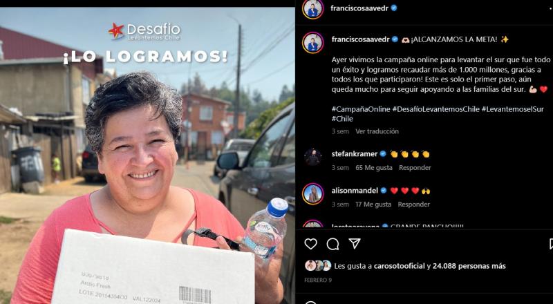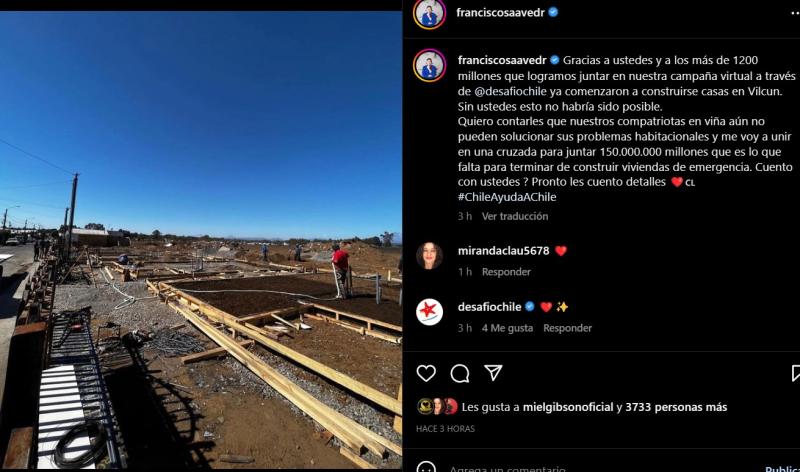 "Gracias a ustedes y a los más de 1200 millones que logramos juntar en nuestra campaña virtual a través de @desafiochile ya comenzaron a construirse casas en Vilcun. Sin ustedes esto no habría sido posible", escribió el animador de “Te paso a buscar”, que iniciará con nueva temporada.