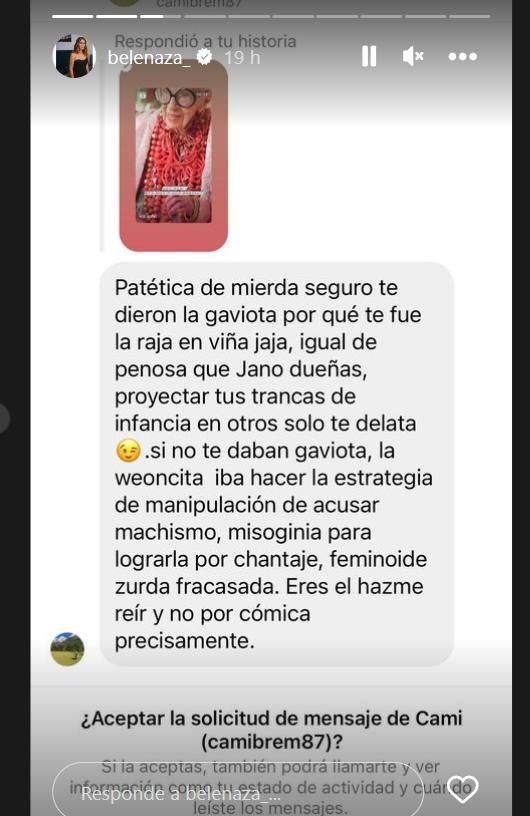 Belén Mora mostró en sus historias de Instagram los violentos mensajes que le llegan en por mensajes en su Instagram. La comediante dio cuenta de violentos comentarios como "patética" o "picante".