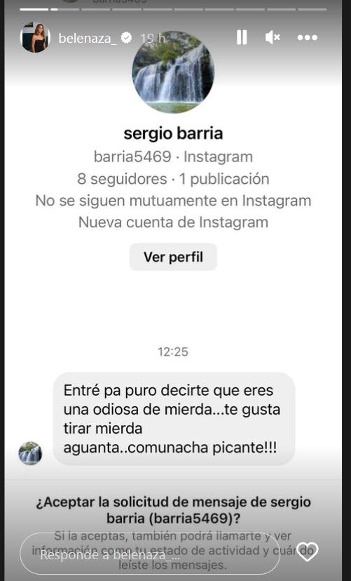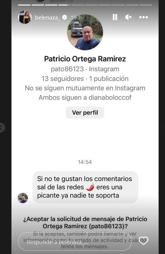"Si no te gustan los comentarios, sal de las redes. Eres una picante, ya nadie te soporta", decía otro mensaje, que Belén Mora optó por mostrar para dar cuenta del odio en redes sociales.