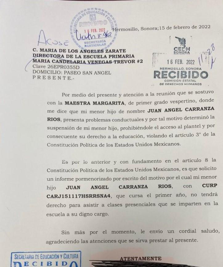 “Hice la solicitud a la directora de manera formal y personal el jueves pasado de un escrito del porqué a mi hijo le negaban el acceso al plantel y se negó a dármelo (la profesora), hice un documento el cual le presente solicitándole lo mismo e igual se negó a dármelo (adjunto documento)”, dijo, junto a una foto del reclamo.