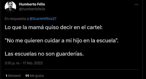 “Lo que la mamá quiso decir en el cartel: "No me quieren cuidar a mi hijo en la escuela". Las escuelas no son guarderías”, le escribió otro usuario.