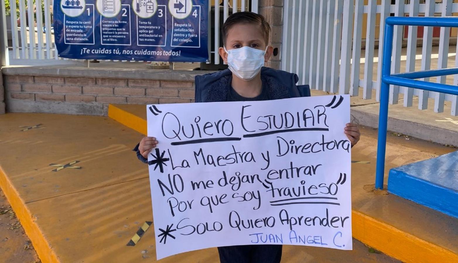 "Quiero estudiar. La Maestra y Directora no me dejan entrar porque soy 'travieso'. Solo quiero aprender", dice el cartel que lleva el niño pidiendo volver.