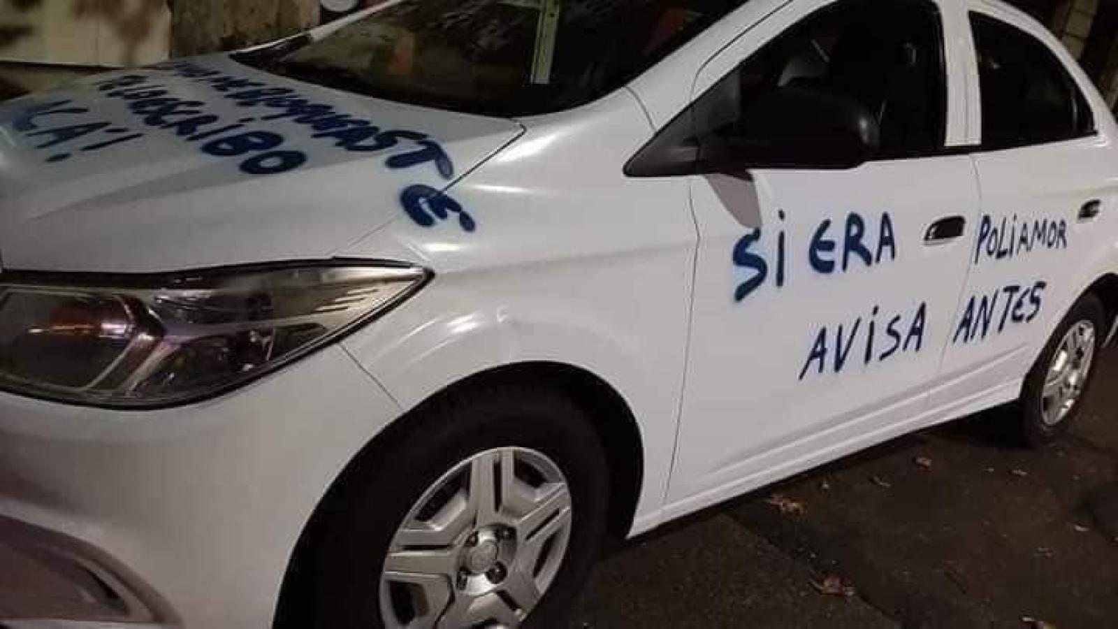 En concreto, las imágenes difundidas son tres, al igual que los mensajes. El primero estaba en el capó del auto y decía: "Como me bloqueaste, te lo escribo acá", mientras que el de la puerta del copiloto decía "relación abierta es cuando aceptan los dos".