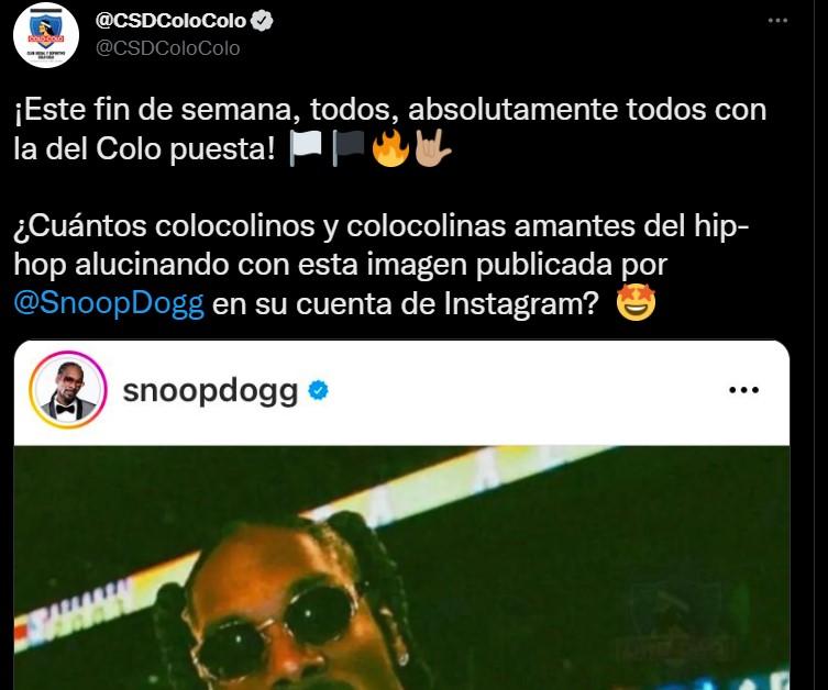“¡Este fin de semana, todos, absolutamente todos con la del Colo puesta! ¿Cuántos colocolinos y colocolinas amantes del hip-hop alucinando con esta imagen publicada por @SnoopDogg en su cuenta de Instagram?”.