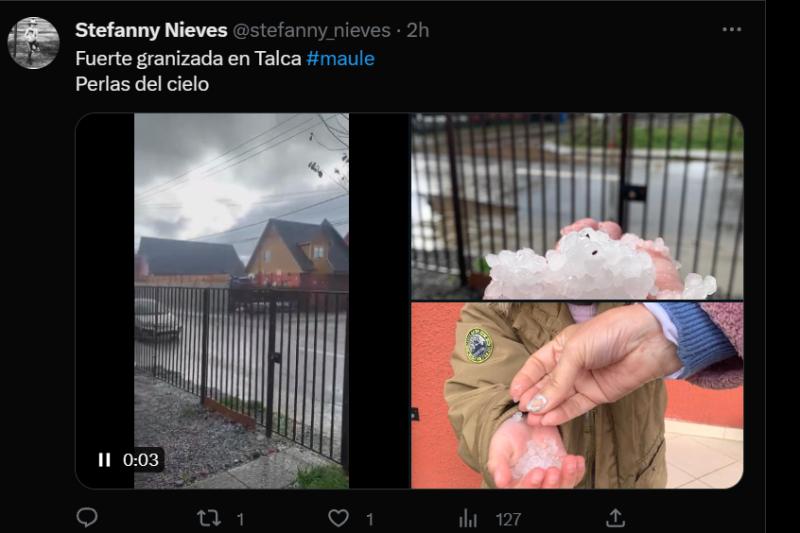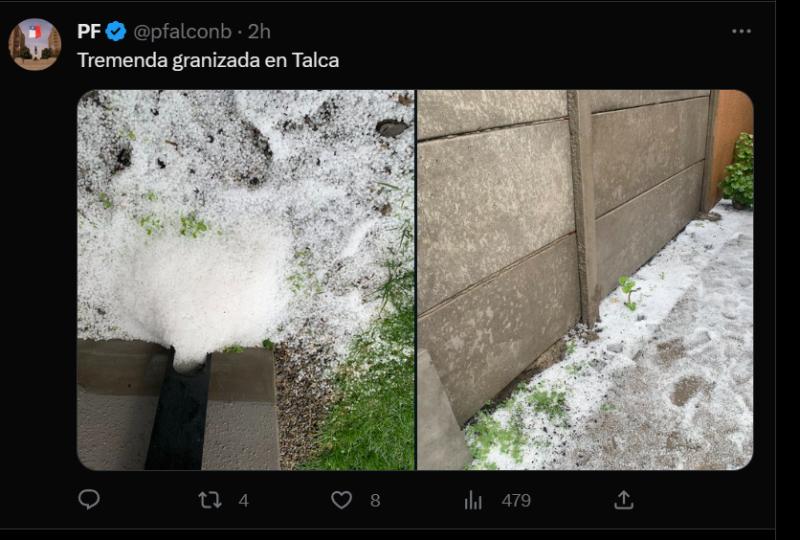 "Tremenda granizada en Talca", escribió el usuario @pfalconb, acompañado de imágenes en las que se ve los granizos.