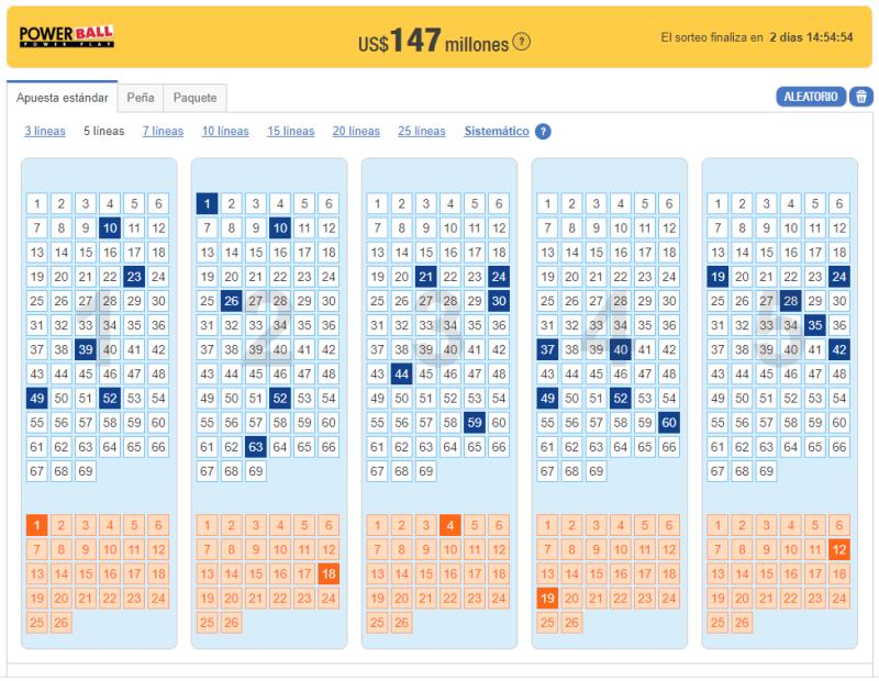 1. Entra en la página del Powerball en TheLotter y elige tus números de la suerte: 5 números principales y un número adicional.