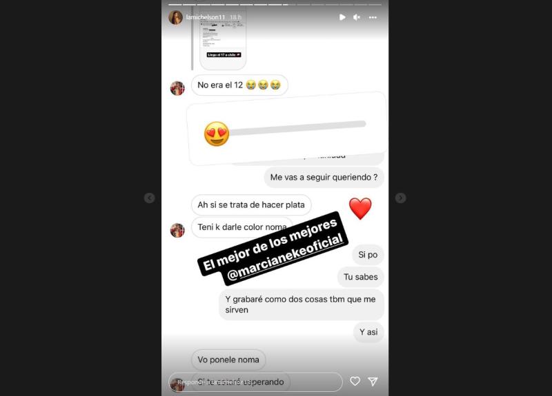 En sus historias de Instagram, Ignacia Michelson mostró una íntima conversación que tuvo con su pareja Marcianeke. En el chat, la modelo mostró el lado más tierno y comprensivo del cantante urbano.
