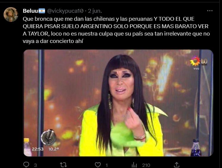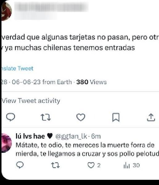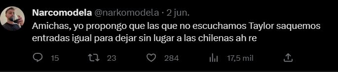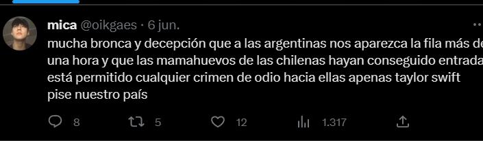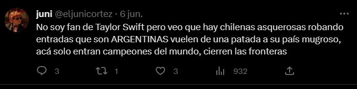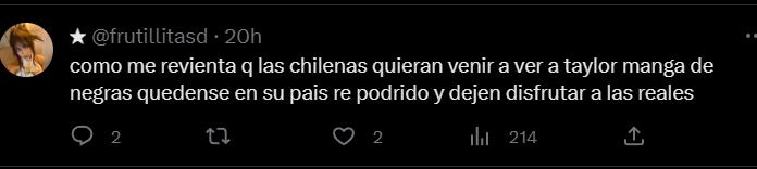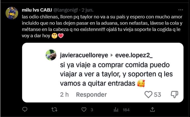 Otros cuestionables comentarios en redes sociales son: "Peruanas paraguayas URUGUAYAS viniendo a ver a taylor: ok. CHILENAS????? CHILENA Q VEO CHILENA Q BALEO", "no es mí culpa q taylor ni registre su país la p... ojalá les agarre un terremoto y no puedan venir", "a mi ni me gusta taylor pero ver a las swifties peleando con las CHILENAS me alegró la tarde cuenten conmigo hermanas yo siempre estoy para quemarle el pelo a alguna en un recital".