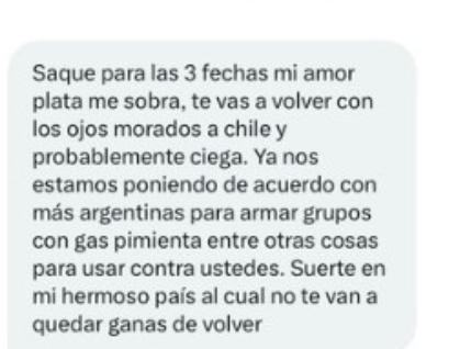 Una usuaria chilena mostró las amenazas que le llegaron a través de comentarios y mensajes: "matate, te odio, te mereces la muerte forra de mie... te llegamos a cruzar y sos pollo pelo...", "te vas a volver a Chile con los ojos morados y probablemente ciega", le escribieron.