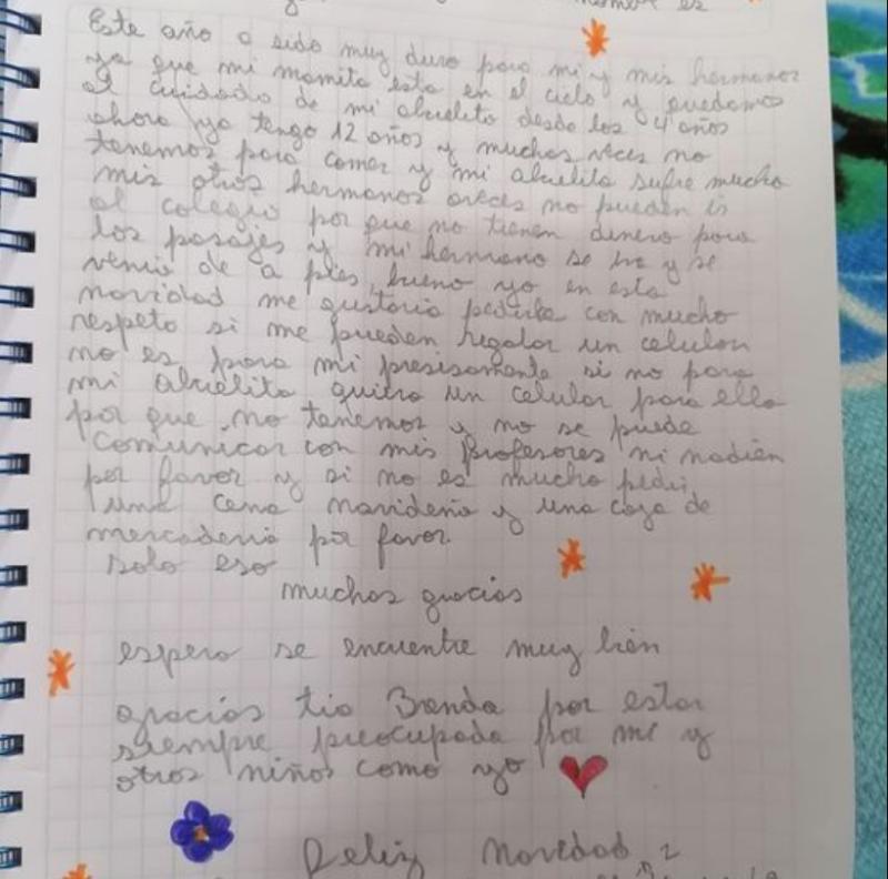 La niña explica en la carta que “este año ha sido muy duro para mí y mis hermanos, ya que mi mamita está en el cielo y quedamos al cuidado de mi abuelita desde los 4 años. Ahora yo tengo 12 años y muchas veces no tenemos para comer”.