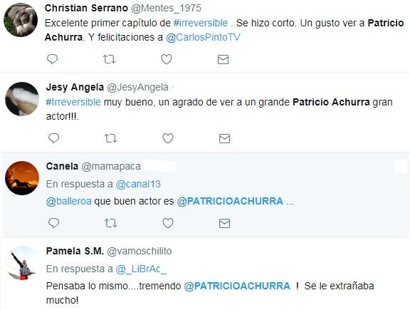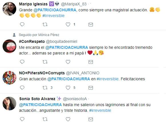 Constanza Achurra, hija del intérprete, también utilizó su cuenta de Twitter para destacar la performance de su padre. “Tremenda actuación de mi viejo seco Patricio Achurra en #Irreversible. Un lujo verlo, que ganas de verlo en teleseries o en cine de nuevo”, escribió.