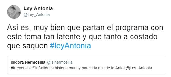 La cuenta oficial de Twitter de quienes buscan concretar el proyecto (@Ley_Antonia) destacó la realización del capítulo. “Muy bien que partan el programa con este tema tan latente y que tanto ha costado que saquen”, expresó.