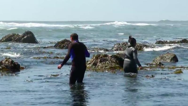 Con traje de buzo, Pancho y Georgina entran a las rocas del mar a recolectar estas nutritivas algas. Georgina se mueve ágilmente en la fría agua, con ya años de experiencia en esta labor, mientras que Pancho sigue su camino.