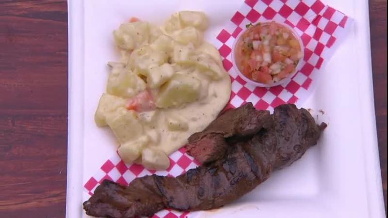 Cada equipo hizo lo suyo. El equipo azul preparó trucha a la parrilla con láminas de piña, acompañada de arroz, verduras asadas y pebre, sobre una hoja de plátano. Mientras que, el equipo morado, que hizo tutos de pollo sancochado a la parrilla acompañado por choclo a la parrilla, plátano frito y guacamole.