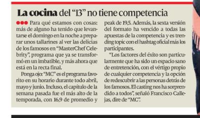 "Para qué estamos con cosas: más de alguno ha tenido que levantarse él domingo enla noche a prepa rar unos tallarines al ver las delicias delos famosos en “MasterChef Celebrity”; programa que ya se transformó en un imbatible; y más ahora que está enla recta final. Ponga ojo: “MC” es el programa favorito en su horario durante todo abril, mayo y junio.