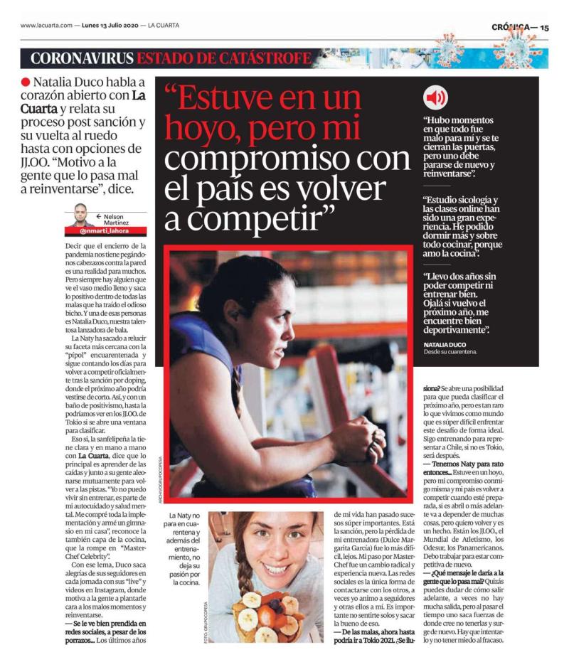 Estuve en un hoyo, pero mi compromiso conmigo misma y mi país es volver a competir cuando esté preparada, si es abril o más adelante va a depender de muchas cosas, pero quiero volver y es un hecho. Están los JJ.OO, el Mundial de Atletismo, los Odesur, los Panamericanos. Debo trabajar para estar competitiva de nuevo.
