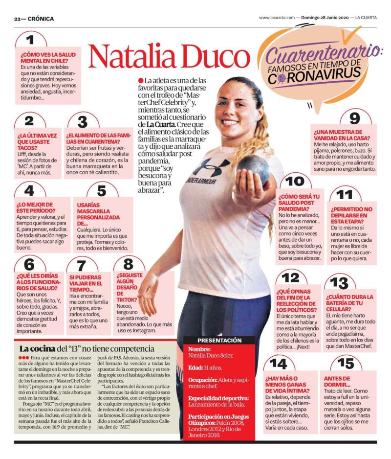 Natalia Duco es una de las queha llegado más lejos en la competencia y se sigue perfilando como una de las favoritas del público, aquí la atleta de 31 años y aspirante a chef jugó con el Diario La Cuarta y nos emocionó a todos con sus palabras para el personal médico que hoy se la juega por los chilenos en todo Chile.