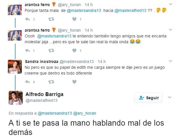 El aludido no se había manifestado sobre los dichos de su compañera. Sin embargo, esta semana se cansó y le respondió, a su manera, a través de sus redes sociales. Específicamente, por su cuenta oficial de Twitter (@masteralfred13).