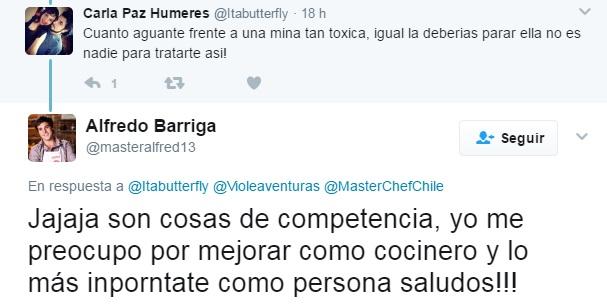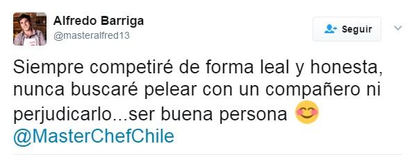 A través de su cuenta oficial de Twitter (@masteralfred13), Barriga se refirió a los cuestionamientos de su compañera. Esto tras ser consultado directamente por una seguidora sobre el tema.