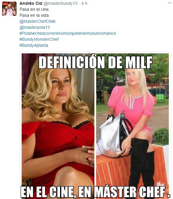 “Pasa en el cine. Pasa en la vida (…) #PolaHecheACorrerElRumorQueTenemosUnRomance #BundyMonsterChef #BundyAplasta”, escribió el aspirante, dando cuenta de su apreciación sobre su rival en la competencia.