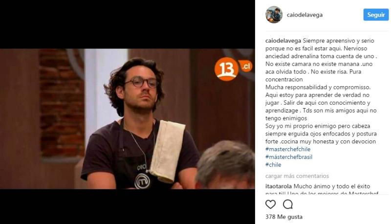 Caio agregó que en esta competencia hay “mucha responsabilidad y compromiso. Aquí estoy para aprender de verdad no jugar. Salir de aquí con conocimiento y aprendizaje. Todos son mis amigos aquí no tengo enemigos. Soy yo mi proprio enemigo, pero cabeza siempre erguida ojos enfocados y postura forte. Cocina muy honesta y con devoción”.